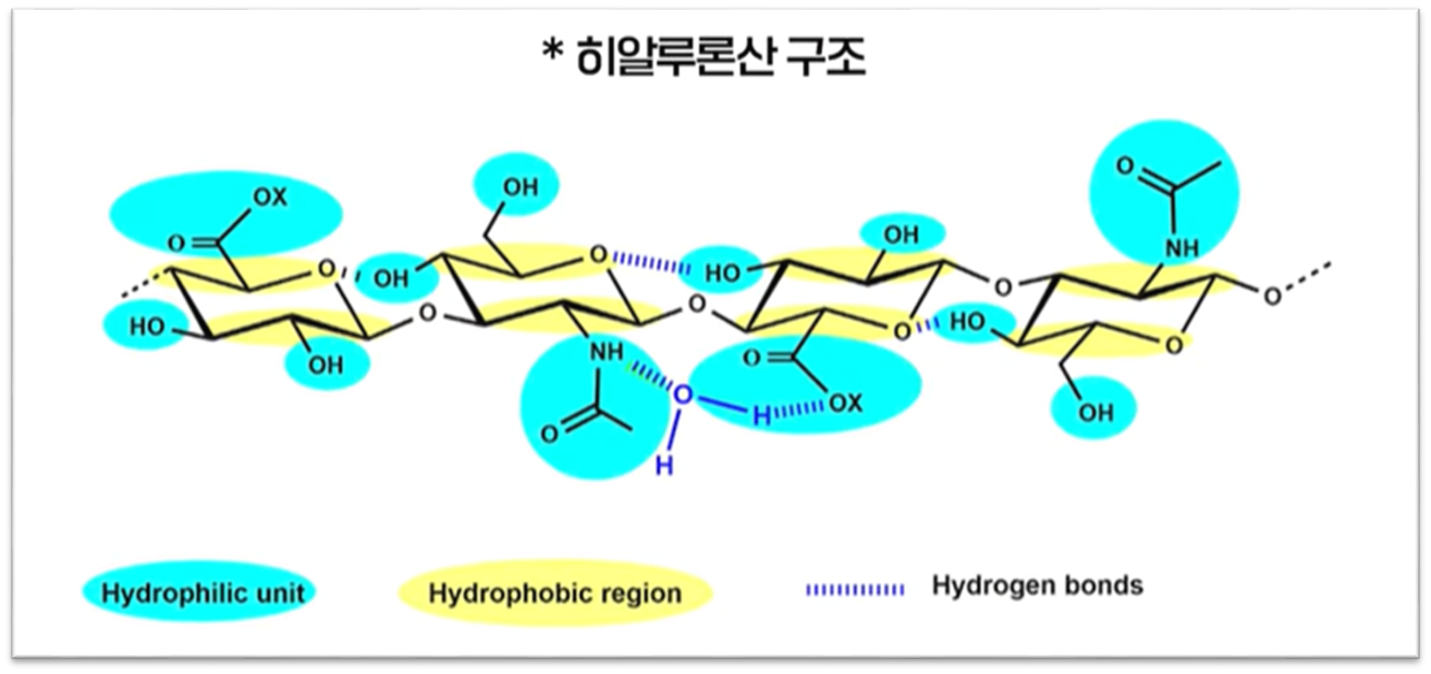 첫째, 수분을 끌어당기는 역할이에요, 히알루론산은 자기 무게의 약 1,000배에 달하는 수분을 끌어당길 수 있다고 알려져 있어요 (Papakonstantinou et al.,2012,Dermato-Endocrinology)